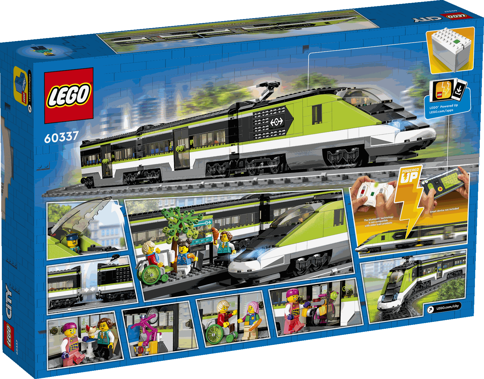 Das LEGO® City Set Personen-Schnellzug (60337) beinhaltet eine ferngesteuerte Hochgeschwindigkeitslok mit funktionierenden, abblendbaren Scheinwerfern und LEGO Powered Up Technologie, einen Speisewagen, einen Personenwagen, einen Bahnsteig, 24 Schienensegmente und 6 Minifiguren für unzählige Rollenspiele und Eisenbahnabenteuer.