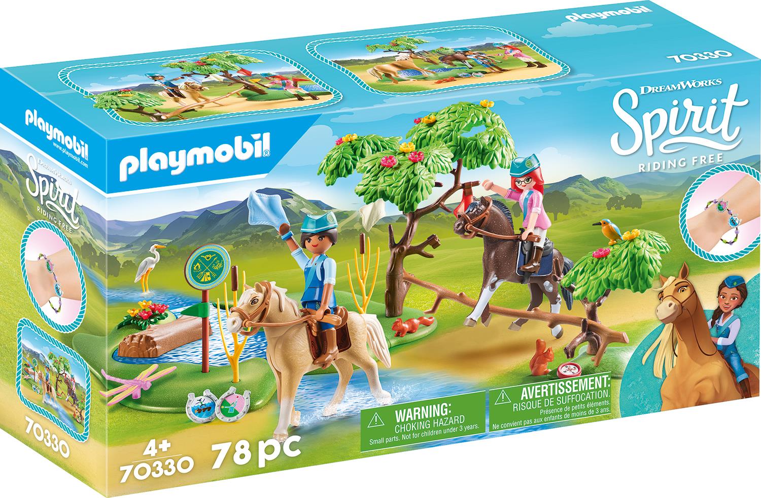 Die PALs das sind Pru, Abigail und Lucky. Die drei Freundinnen sind unzertrennlich und stellen sich im Sommercamp gemeinsam spannenden Wettkämpfen mit den BUDs: Bebe, Ursula und Daphne. Auf einem Baumstamm im Wasser müssen die Mädchen zeigen, wer länger die Balance halten kann, aber das ist ganz schön wackelig. Mit der roten und gelben Flagge können die Mädchen den Weg weisen und dann heißt es ab auf die Pferde. Im Nu springt Pru auf Chica Linda und Daphne auf Pferd Marbles und dann beginnt das Wettreiten. Auf die Siegerin wartet ein tolles Hufeisenabzeichen. Das Spielset Herausforderung am Fluss enthält die Charaktere Pru mit Pferd Chica Linda und Daphne mit Pferd Marbles, sowie einen Flusslauf mit Baumstamm und Baum für das Balancespiel und eine rote und gelbe Signalflagge für den Flaggen-Signal-Wettkampf. Für alle großen Spiritfans gibt es ein Freundschaftsarmband mit Hufeisenclip für jeden erfolgreich bestandenen Wettbewerb.