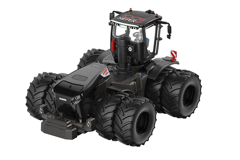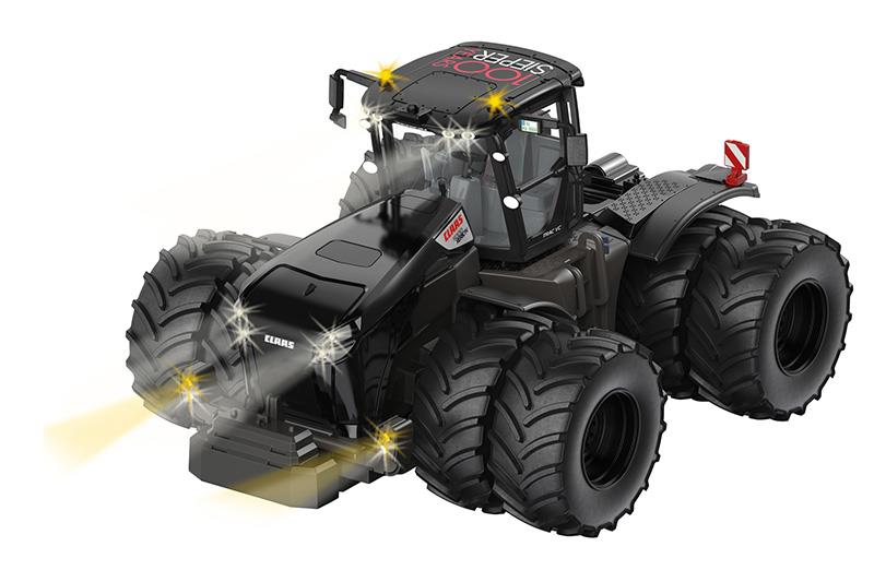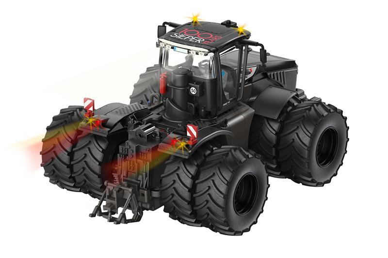 Der Claas Xerion 5000 TRAC VC ist bereits in der Serienausführung eine imposante Erscheinung. Das Jubiläumsmodell 100 Jahre Sieper in mattschwarzer Lackierung und mit Doppelbereifung macht noch mehr Eindruck. Die einzigartige Ausführung ist limitiert. Arbeitsbeleuchtung an, Arbeitsgerät ankuppeln und ab damit auf den Acker. Mit der SIKUCONTROL APP lassen sich mit Smartphone und Tablet die sechs Getriebe, die 22 LEDs und die zahlreichen Funktionen des Traktors steuern. Die Funktionen können wahlweise über die virtuelle Gamepad-Steuerung oder die Bewegungssensoren der mobilen Geräte gesteuert werden. Dieses intuitive Feature bietet zusätzlichen Spielspaß. Per Knopfdruck wird, wie beim Original, die gesamte Kabine gedreht. Vor allem beim Mulchen und bei Siloarbeiten ermöglicht dies eine gute Sicht auf das Heck. Die Steuerung erkennt die geänderte Fahrtrichtung und passt die Steuerbefehle an. Zudem kann das Modell, wie beim Original, über die Hinterachse, mit der Allradlenkung oder mit der sogenannten Hundeganglenkung angetrieben und gelenkt werden. Dabei werden die Vorderräder und die Hinterräder in die gleiche Richtung ausgelenkt. Dies ermöglicht, die Hinterräder auch bei Geradeausfahrt versetzt zu den Vorderrädern laufen zu lassen. Dies reduziert die Spurrinnenbildung und vermindert die Kippgefahr. Die Zwillingsbereifung vermindert zusätzlich bei weichen Böden den Bodendruck des Traktors. Die Reifen sind mit Magneten verbunden, die in den Felgen integriert sind und diese fest verbinden. Dadurch können die Reifen werkzeuglos und sehr schnell an- und abmontiert werden. Die SIKUCONTROL APP steht kostenlos zum Download im App Store und im Google Play Store bereit. Die Einstellungen und Funktionen der App werden laufend aktualisiert. Mit der OTA (Over-The-Air)-Funktion der App kann auch die Software des Traktors direkt aktualisiert werden.